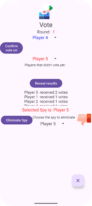 Apabila semua pemain telah mengundi, anda boleh mendedahkan keputusan dan memilih pengintip untuk dihapuskan.