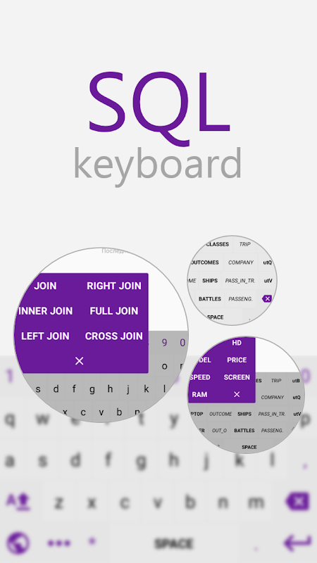 Всплывающие клавиатуры появляются по долгому нажатию на клавиши с буквами английского алфавита и с именами столбцов таблиц. Символьная клавиатура доступна по долгому нажатию на клавишу с точкой.
