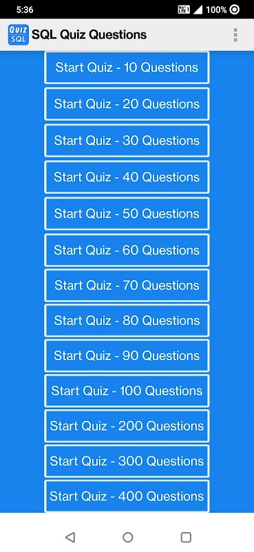 Belajar aplikasi percuma SQL membuktikan SQL (Structured Query Language) Amalan Soalan untuk membantu Pemaju SQL. Dalam Belajar aplikasikan aplikasi SQL menyediakan 2500+ soalan pilihan berganda. Dalam Belajar aplikasi SQL percuma dilindungi topik SQL, PL / SQL, soalan-soalan sampingan SQL Server dan pertanyaan sisi Pangkalan Data SQL.