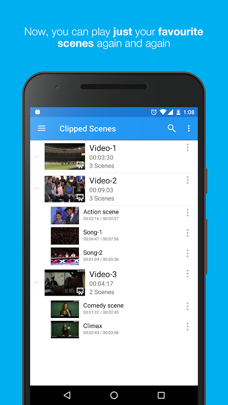 Potong video anda ke dalam sub-klip dan mainkan setiap sub-klip berasingan seolah-olah ia adalah video yang berbeza yang wujud dalam peranti anda. Menonton hanya adegan tertentu yang paling anda sukai (aksi, komedi, romantik, lagu dan lain-lain) tanpa memainkan video penuh dan kesusahan mencari adegan kegemaran anda.