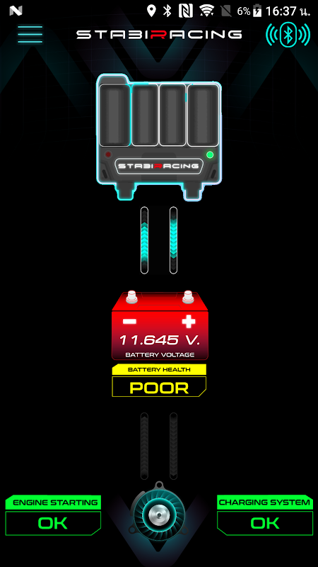 Aplikasi ini memaparkan voltan bateri kereta semasa, prestasi pengecasan bateri, voltan permulaan enjin disambungkan ke kotak Stabiracing melalui Bluetooth