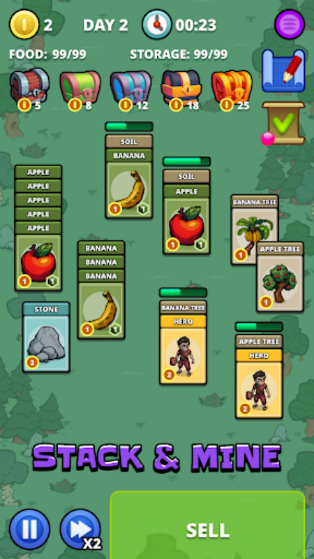 Stack Town is a management simulation game to center on a village survival theme. Here, different cards represent different resources, and you can create more resources by stacking and using the cards.