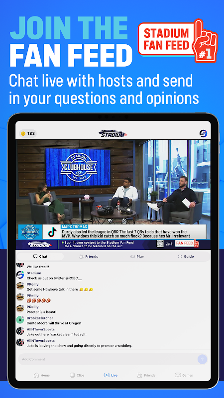 Apl ini menyediakan pengalaman interaktif sepenuhnya untuk bukan sahaja menonton rancangan, tetapi berbual secara langsung, bermain permainan bersama hos dan peminat serta berhubung dengan rakan. Bahagian yang terbaik? Hampir semua yang anda lakukan dalam apl memberi anda ganjaran dalam bentuk Bally Bucks yang boleh ditebus untuk pengalaman dan hadiah yang hebat.