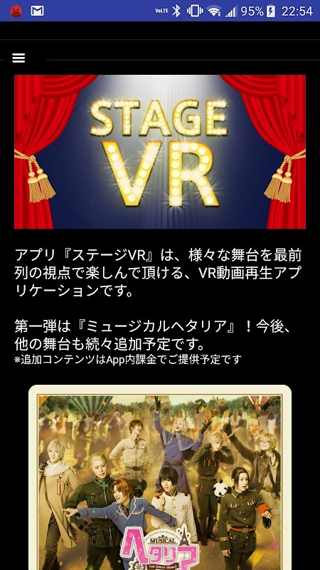 Stage VRは様々なミュージカルを最前列の視点で楽しむことが出来る、ミュージカル専門VRアプリケーションです。