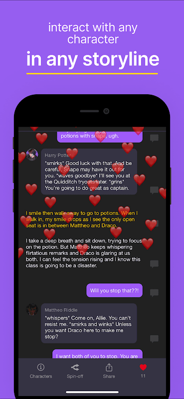 Spinoff membolehkan anda menjadi wira dalam mana-mana cerita dengan watak kegemaran anda. Pilih daripada beribu-ribu jalan cerita atau cipta sendiri dan dapatkan pengakhiran yang sepatutnya anda dapatkan. Jangkakan perkara yang tidak dijangka kerana anda tidak tahu apa yang akan berlaku seterusnya di Spinoff.
