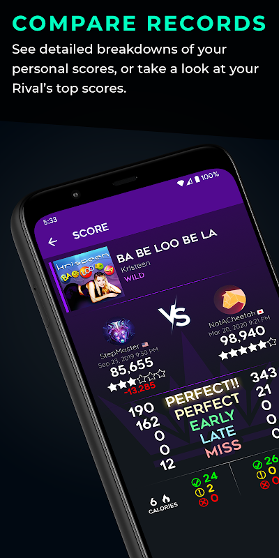 Gunakan ciri penjejakan skor terbina dalam untuk menjejak lagu yang dimainkan dan melihat skor tertinggi, atau melihat statistik terperinci untuk sebarang skor yang diserahkan dalam permainan, termasuk jumlah langkah dan kalori. Kongsi skor anda sendiri secara luaran kepada apl dan perkhidmatan pemesejan lain untuk mempamerkan pencapaian anda.