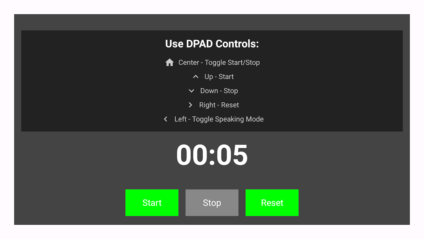 Apl StopWatch TV ialah jam randik yang anggun dan berfungsi untuk Android TV. Dengan kawalan DPAD yang intuitif, pengguna boleh memulakan, menghentikan, menetapkan semula dan menogol mod pertuturan dengan mudah. Apl ini mempunyai pemasa kira detik dengan kesan bunyi yang boleh disesuaikan untuk setiap tanda, atau pilihan untuk menggunakan teks ke pertuturan untuk mengumumkan masa berlalu. Direka bentuk dengan mengambil kira kebolehaksesan, ia menyediakan UI interaktif yang melaraskan berdasarkan tindakan pengguna. Sama ada anda memerlukan pemasa visual atau jam randik yang didayakan audio, aplikasi ini sesuai untuk menjejak masa dengan cekap dan berkesan.