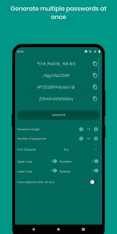 Dengan Penjana Kata Laluan Kuat anda boleh menjana kata laluan dalam apa jua panjang dengan kerumitan yang anda inginkan dengan satu sentuhan butang. Hanya tetapkan panjang kata laluan yang anda inginkan, sama ada kata laluan itu termasuk huruf besar, huruf kecil, nombor dan/atau simbol dan apl akan melakukan yang lain.
