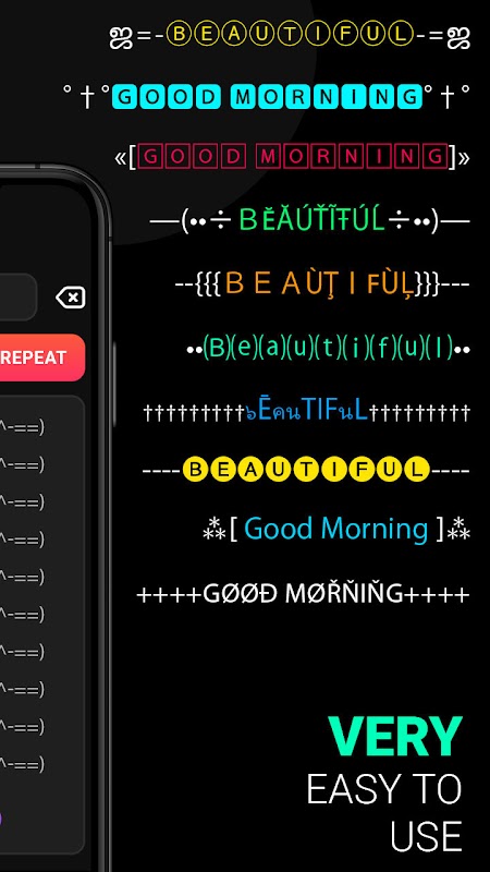 Muat turun aplikasi dan hantar teks kepada rakan/keluarga/orang tersayang anda apa-apa teks bergaya dan menarik perhatian mereka dengan kesejukan anda. Ia tidak mengambil banyak ruang pada telefon anda, ia tidak akan menggunakan RAM anda sebanyak itu semasa menggunakan aplikasi atau di latar belakang. Jadilah lebih keren dan kelakar dengan ciri menarik dan kongsi dengan orang lain.