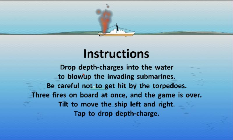 Drop mendalam caj ke dalam air untuk blowup kapal selam menyerang. Berhati-hati untuk tidak dilanda torpedo. Tiga kebakaran di atas kapal sekali gus, dan permainan berakhir. Dongakkan untuk menggerakkan kapal kiri dan kanan. Ketik untuk menggugurkan mendalam percuma.