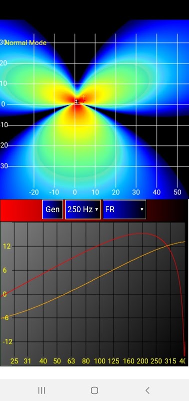 Aplikasi simulasi akustik dengan fokus pada frekuensi rendah. Grafik berwarna-warni.