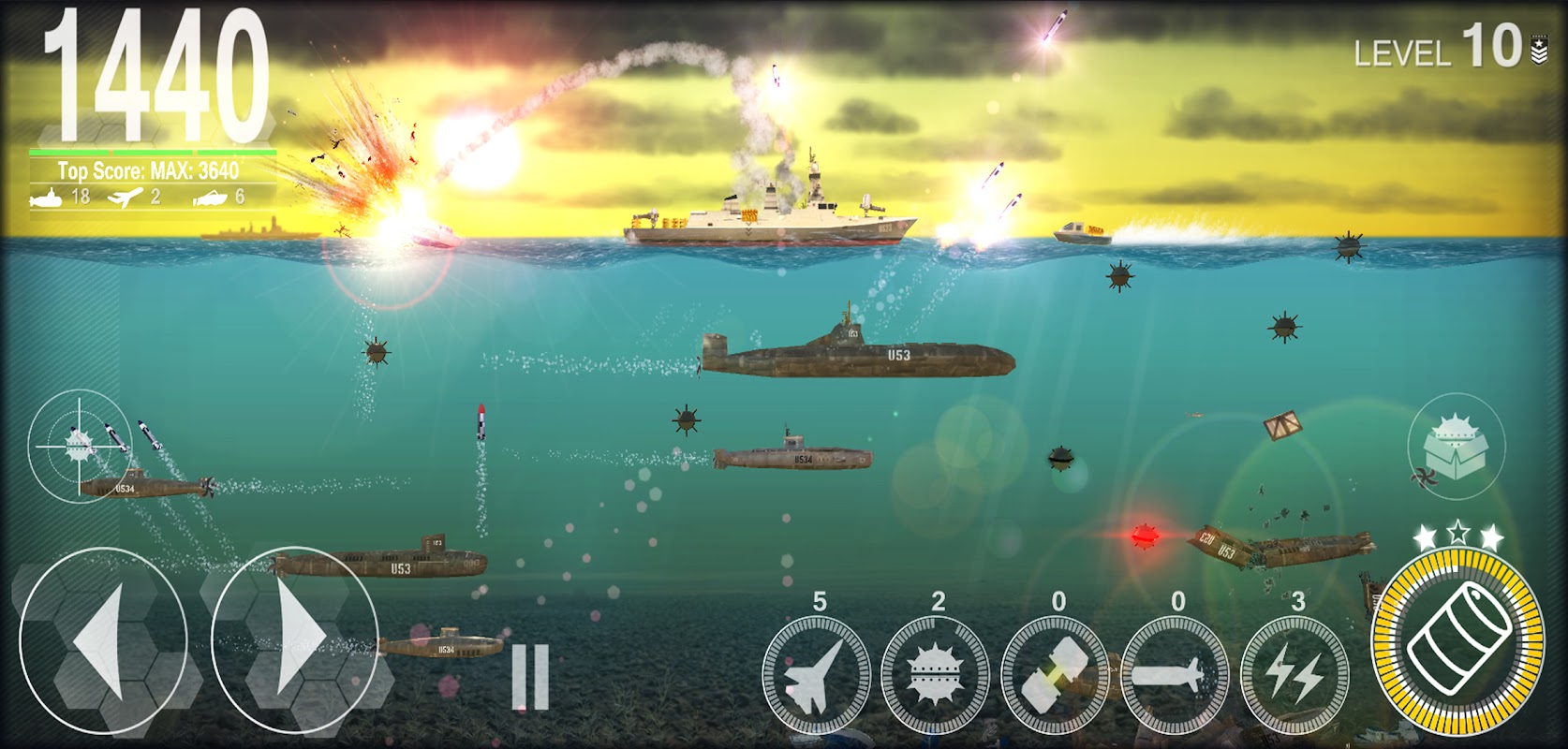 Pastikan anda mengelak daripada terkena dalam persekitaran yang bermusuhan ini oleh lombong, bom, torpedo dan peluru berpandu! Gunakan kemahiran anda untuk memindahkan Destroyer ke perairan yang lebih selamat sambil menjatuhkan caj kedalaman, peluru berpandu dan senjata khas lain ke dalam laut tempat musuh anda mengintai