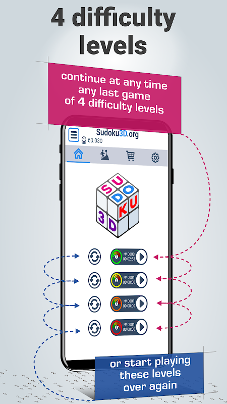 ► Kerumitan Sudoku bergantung pada bilangan sel yang diisi pada mulanya dan pada kaedah yang perlu digunakan untuk menyelesaikannya. Terdapat 4 tahap kesukaran dalam Sudoku3D. 1 tahap kesukaran untuk pemula, 4 - untuk profesional.