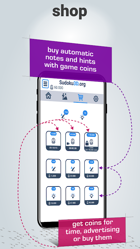 ► Dapatkan syiling permainan dengan bermain Sudoku 3D untuk masa tertentu atau dengan menonton iklan.