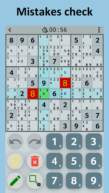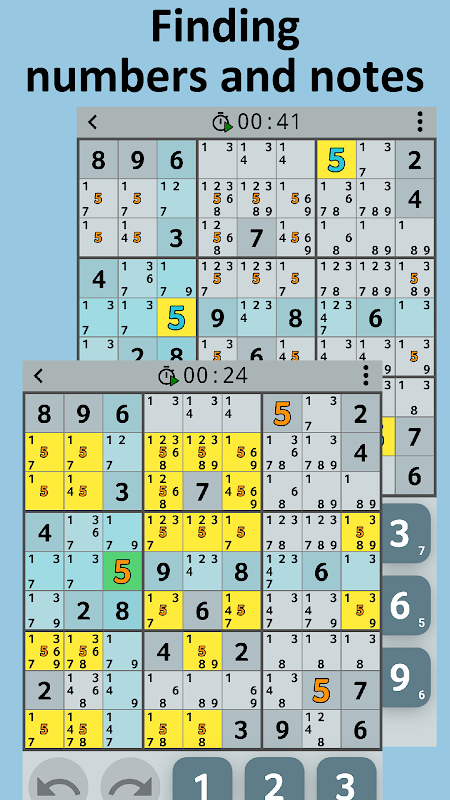 Terdapat semua yang anda perlukan untuk permainan sudoku klasik yang menyenangkan - carian digit, petua, nota, kemungkinan angka menunjukkan, dan dalam kes kesalahan - petunjuk dan tindakan membatalkan!