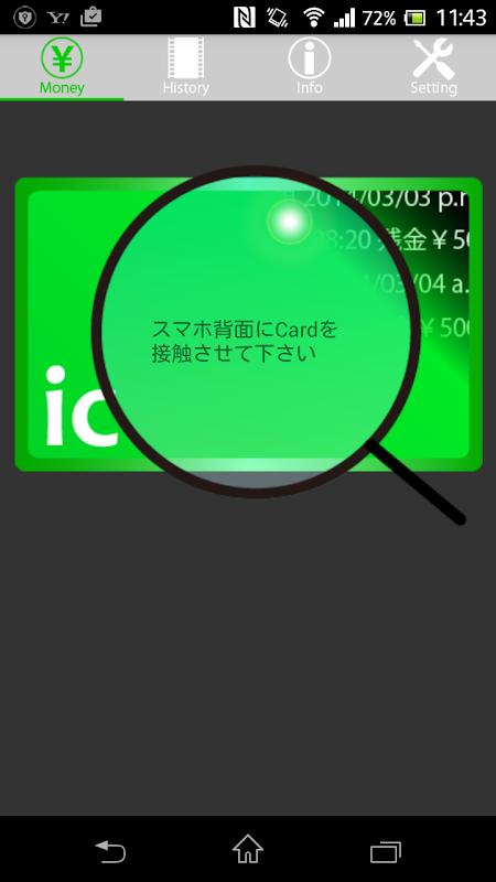 Ini ialah aplikasi yang membolehkan anda menyemak baki Suica anda dengan cepat. Hanya pegang kad anda di atas tag IC di belakang telefon pintar anda dan baki anda akan dipaparkan. Sila gunakan ini apabila anda tidak yakin tentang baki anda.