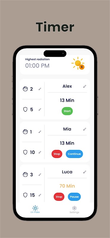 Dengan SunProtect, anda boleh dengan mudah dan selamat menentukan berapa lama anda boleh berada di bawah sinar matahari tanpa risiko selaran matahari. Apl mengira indeks UV secara automatik berdasarkan lokasi anda—sama ada dimasukkan secara manual atau ditentukan melalui GPS. Hanya masukkan pelindung matahari (SPF) dan jenis kulit terpakai untuk sehingga empat individu, dan SunProtect akan mengira masa pendedahan matahari yang ideal untuk setiap orang.