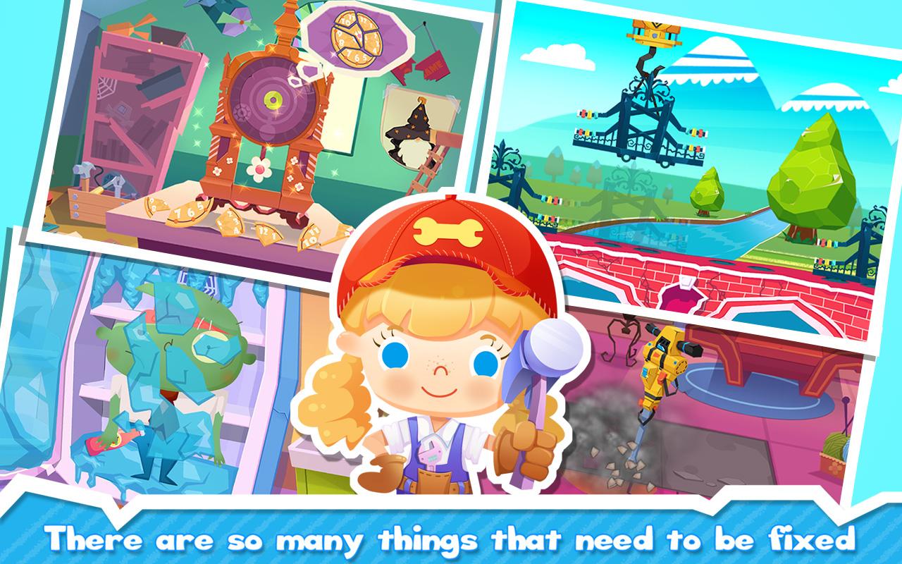 There, there! Candy is here! Wow, look at her. She’s kind of a little repair expert who has a knack for fixing everything. The sweet child lives in an amazing town, a community full of happiness and love. You can smell that sweetness in the air every single day. But sometimes things happen that makes a lovely day bad. Oops, the fish tank is cracked. Oh, no…is this the seesaw’s broken body? Even Toby's space “vehicle” has fallen apart. But, it’s no big deal. Super Candy always shows up at the right moment and gives all those items a second life. Got anything that needs to be fixed? Let this little wonder girl give it a magic touch!