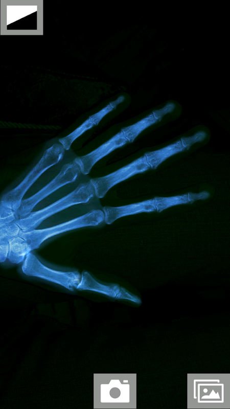 This app use video camera. Super XRay Camera shows xray scanning in real time video. With this app you can see the skeleton of the hand.