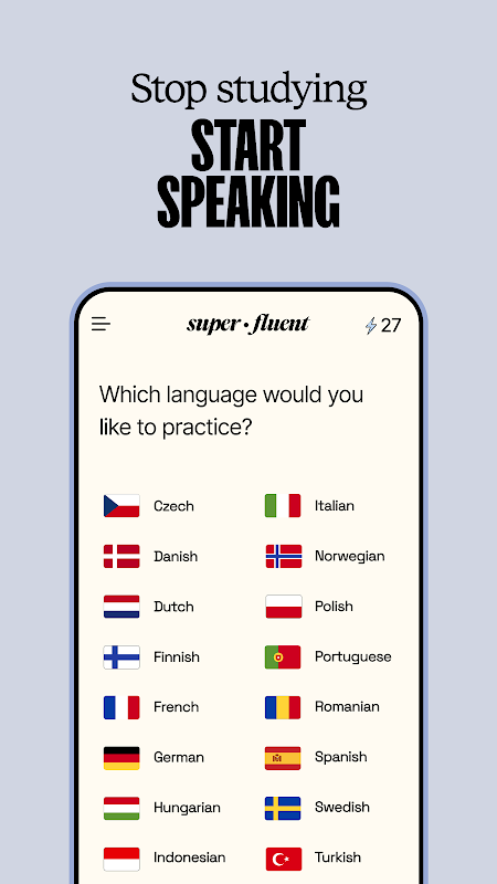 Bersedia untuk melampaui asas? Menjadi fasih tanpa rasa takut dengan pembelajaran bahasa perbualan yang direka untuk kehidupan seharian. Superfluent meletakkan anda ke dalam beratus-ratus senario dunia sebenar dan memberi anda maklum balas berterusan untuk membantu anda beralih daripada separa fasih kepada Superfluent dengan lebih pantas daripada yang anda sangkakan.