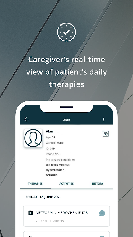 - Pesakit: Pesakit adalah orang yang menerima rawatan dan ubat untuk keadaan jangka panjang. Pesakit hanya perlu bertindak balas terhadap pemberitahuan ketika diterima, dengan mengesahkan ubat yang diambil dan / atau memasukkan bacaan melalui peranti berpasangan atau secara manual.