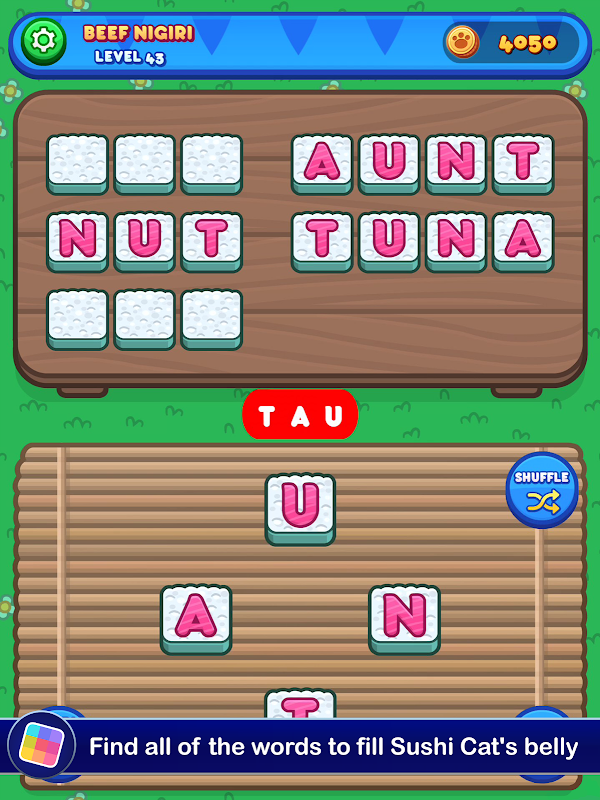Setiap tingkat memberi anda satu set huruf yang perlu anda gunakan untuk membuat kata-kata. Terdapat menu yang ditetapkan, dan anda perlu mencari semua perkataan yang diperlukan untuk terus maju. Sekiranya anda menghadapi masalah, anda boleh mendapatkan petunjuk sebagai ganti beberapa syiling. Anda akan mendapat lebih banyak keuntungan semasa anda pergi, tetapi jika anda ingin mengumpulkan stok anda perlu memikirkan banyak kata bonus. Semakin besar perbendaharaan kata anda, semakin banyak makanan yang dapat anda siapkan untuk Sushi Cat. Semakin banyak Sushi Cat makan, semakin bahagia! Rasa kemenangan tidak pernah begitu segar!