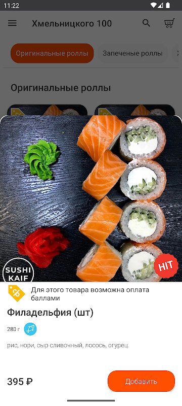 Dalam aplikasi Sushi Kaif anda boleh mengatur penghantaran sushi dan gulung dengan mudah dan ringkas