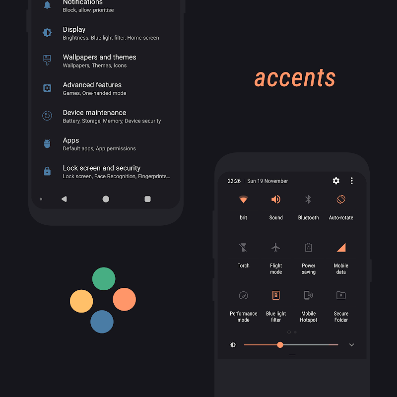& lembu; Tema ini disesuaikan untuk peranti Samsung dengan firmware stok pada Nougat, Oreo dan Pie. Untuk syarat-syarat Set Substratum, seperti root dan plugin, baca dibawah.