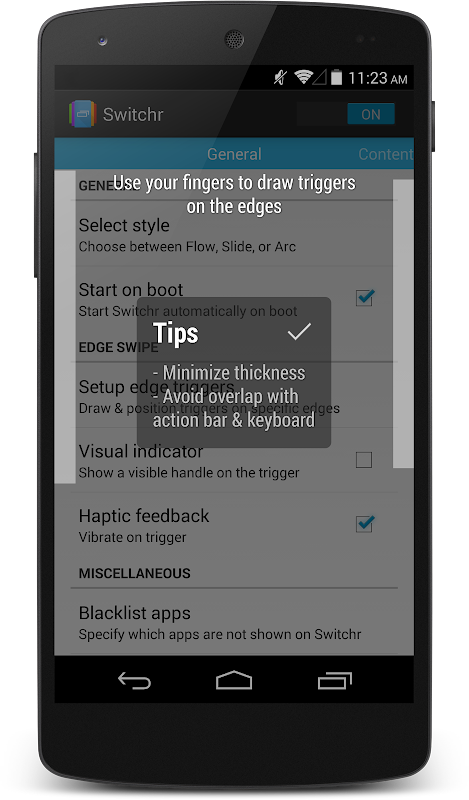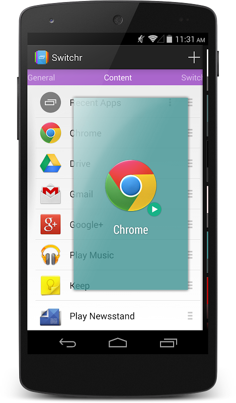 To use Switchr, just swipe in from the edge, make your selection and let go! Switchr has three different styles (Flow, Slide, and Arc), each with it's own unique way of displaying your chosen recent/running/favorite apps. With live switching, you can switch between apps in real time as you swipe! Switchr can even replace your default search action, allowing you to switch between apps using the search key or by swiping up from the navigation bar. You can also pin your favorite apps and rearrange the order to your liking.