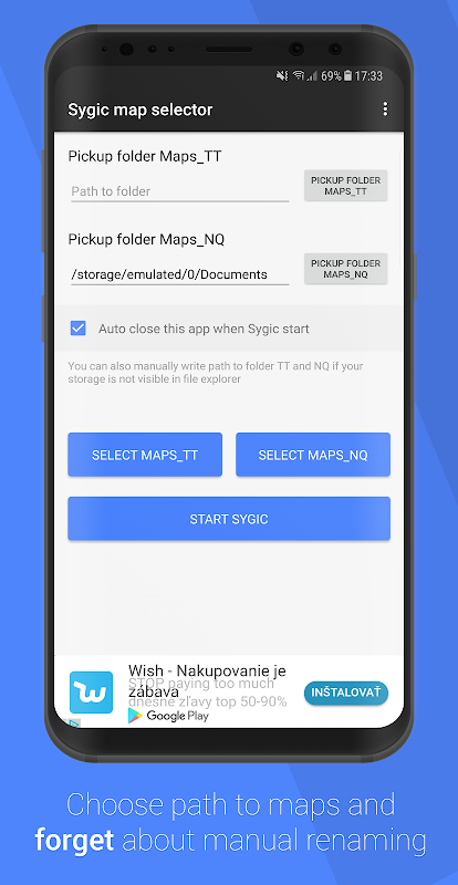 First run Sygic maps selector which offers me to choose the pathes to Maps_TT and Maps_NQ / storage / extSdCard / Sygic (via the explorer)