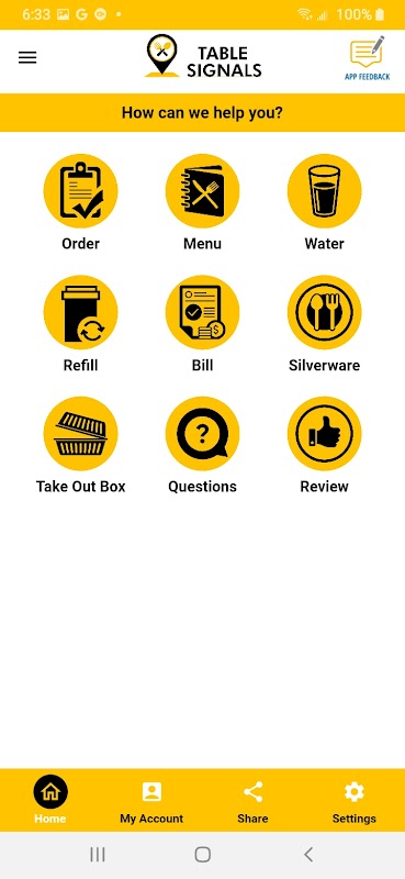 Apl Isyarat Jadual ialah aplikasi pertama seumpamanya yang direka untuk membantu pelanggan serta pemilik bar dan restoran. Untuk pelanggan restoran, kami melakukan ini dengan menjadikan telefon pintar anda sebagai paparan untuk membolehkan pelayan dan pelayan bar mengetahui dengan tepat apa yang anda mahukan. Anda juga boleh memaklumkan pelayan anda apabila anda memerlukan bantuan atau bersedia untuk membuat pesanan dengan menekan satu butang pada telefon pintar anda dan meletakkannya di atas meja anda supaya ia boleh dilihat oleh pelayan.