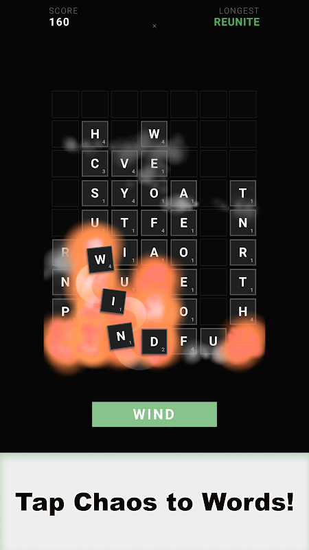 Ketik blok huruf untuk membentuk perkataan. Huruf-huruf itu hilang, papan membersihkan dirinya, dan—kerana huru-hara mencintai anda—lebih banyak huruf turun. Tugas anda?
