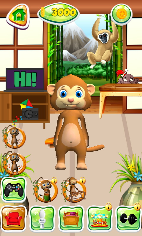 The monkey lives in a house that has many cool rooms. You will make sure that you unlock all of them and see what each of them hides. In the living room, there are many interesting items! For example, you can tap the table to see the caveman who is hiding there! Tap the monkey behind the window and see what happens. Take a look on drawer and the colorful fireworks will attract your attention. Let’s learn the letters together, just watch the tv screen. Do you know that your little hero has musical talent? You will enjoy the sounds he performs on afro drum. Also, he has a balafon, a wooden xylophone. Listen your cute hero while his performance and you will be amazed. The talking monkey has a beautifully decorated bedroom. When it is time for him to take a nap, just turn off the lights for him. The roll whistle will wake him up from his sleep, whenever you want. This animal loves to spend time on the playground. That is where he can jump on his trampoline and play sports. Jungle boy will surprise you, he likes to climb over the trees and to slide down them. The newest game is fun to play, it is relaxing and entertaining at the same time! The monkey has an awesome home gym, where he comes for his daily workout. He prefers the treadmill, so you decide if he is going to run or walk on it. Make sure that your hero stays fit! Now it is time for some fantastic mini games, so try it together and enjoy in these popular adventures. Play Monkey Jump and just tap platform that you want your hero to jump on. Life in the jungle is never boring, and our monkey leads an impressive lifestyle. He is very meticulous, too. In his bathroom he can brush his teeth and take a bath. Later he will wipe with the towel. This top game is for people of all ages, for kids and teenagers, for adults as well. Take care of your virtual animal and be the best guide to him. Talk to the monkey, he will listen very carefully. Later he will repeat your words!