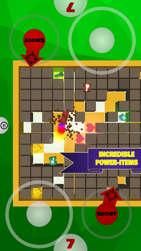 Maneuver your tank over the field and party hard! The first player who completely destroys the tank of the enemy wins. All you need is tactics, skill, and a clever mind! Because the shot bullets are reflected on walls and stones, and bounce off! Destroy wood with three shots and fight your way to the enemy. Or wait for the incredibly powerful power-ups that you can collect:
