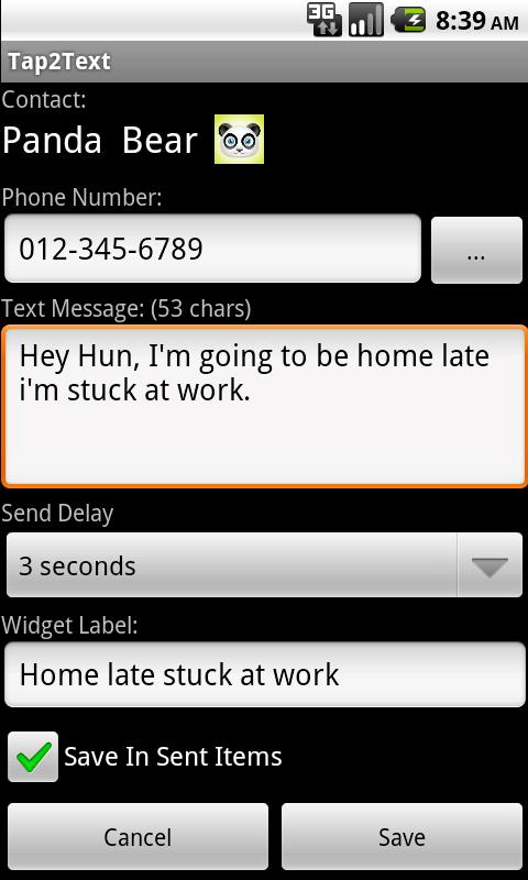 Buat widget skrin utama yang segera membuat mesej TXT / SMS yang telah ditetapkan kepada kenalan. Widget bertindak seperti pintasan untuk menghantar mesej.