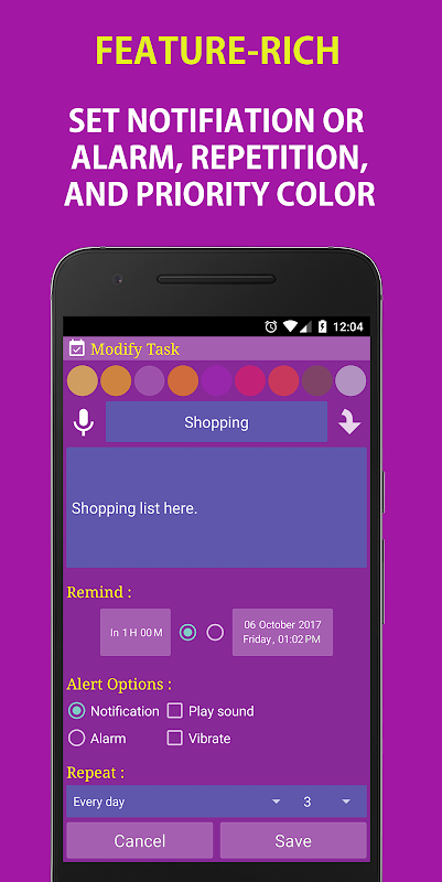 ✔ Tetapkan pemberitahuan, penggera dengan volume crescendo dan / atau getaran.