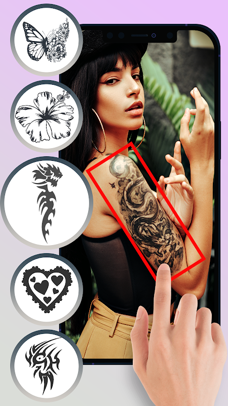 Kamera foto tatu ini akan membantu anda memilih reka bentuk yang sesuai untuk anda. Aplikasi penyuntingan foto tatu kami menjadikannya mudah untuk menyesuaikan saiz dan kedudukan pelekat tatu, jadi anda boleh membuat rupa yang unik. Simulator Tatu adalah satu klik dari anda. Muat turunnya sekarang.
