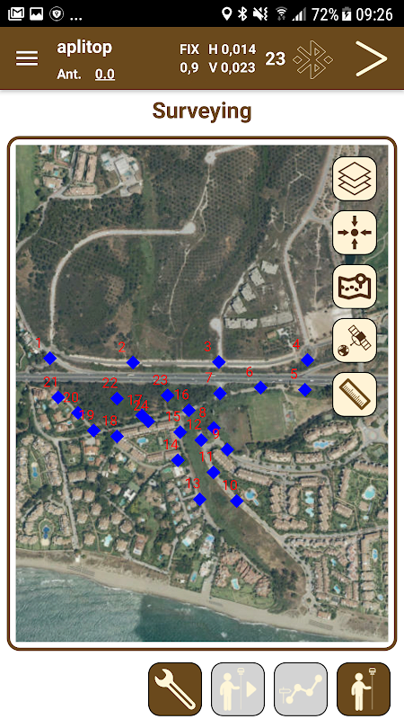 The application allows the survey of topographic points by simply touching a button. For every button, all raw data are stored: date and time, number of point, geographic and projected coordinates, position mode, estimated accuracy and antenna height. They can also be related with a picture, voice note and comments.