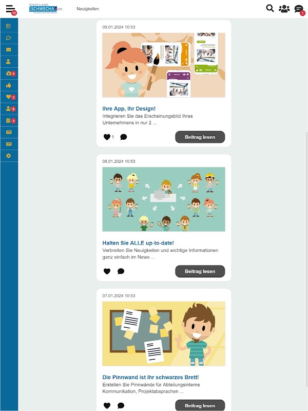 Dengan aplikasi pekerja TeamSchwechat anda akan menemui jenis komunikasi dalaman yang baharu. Sentiasa mengikuti perkembangan berita penting dan tawaran menarik untuk pekerja perbandaran Schwechat, tidak kira di mana tempat kerja anda. Dengan messenger bersepadu anda boleh bersembang terus dengan rakan sekerja anda dan berkongsi pengalaman atau idea peribadi pada papan pin. TeamSchwechat menghubungkan anda dengan seluruh pentadbiran bandar dan menggalakkan kerjasama dan pertukaran dalam komuniti kami yang pelbagai.