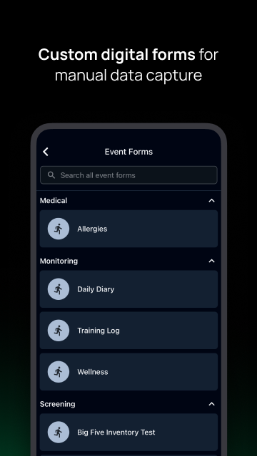 Borang mesra mudah alih membolehkan anda memasukkan data atlet dan ahli perkhidmatan daripada peranti mudah alih anda. Gunakan Kegemaran atau Kalendar untuk memasukkan data dengan cepat untuk acara tertentu. Jatuh turun, peluncur, gambar rajah badan dan banyak lagi menyelaraskan proses kemasukan data pada peranti mudah alih anda. Jejaki metrik kesihatan atlet tersuai yang ditentukan oleh organisasi anda.