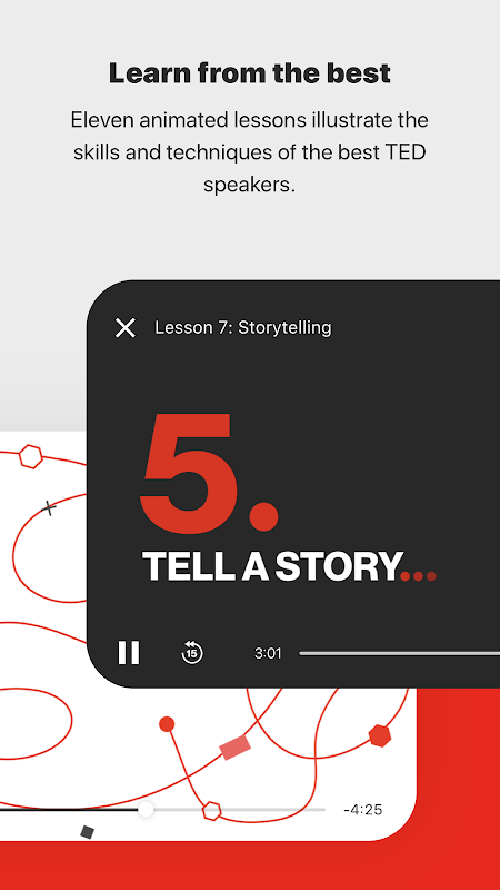 + Kuasai teknik utama yang digunakan penutur TED untuk menyampaikan ceramah yang hebat. Setiap teknik diajar menggunakan animasi dan klip yang jelas dari TED Talks yang terkenal.