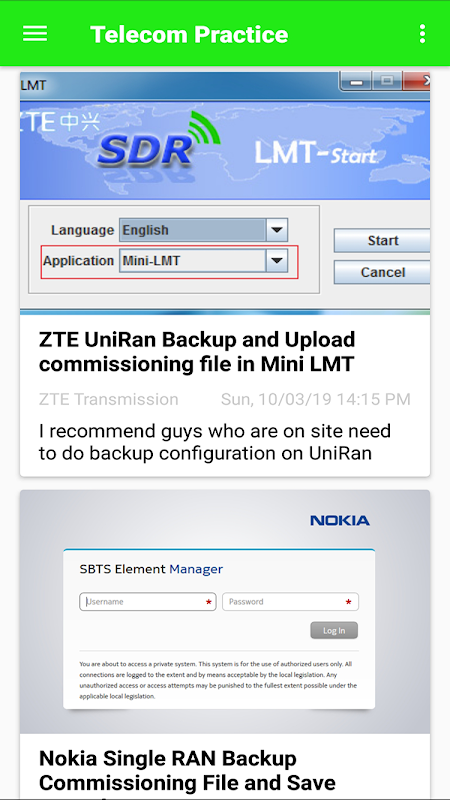 Praktik Telecom adalah panduan untuk mencari beberapa penyelesaian yang kami gunakan untuk menyelesaikannya dalam pengalaman kami. Aplikasi kami untuk penyelenggaraan telekomunikasi termasuk produk Nokia (SRAN, SMFS, MPR, SAR08, SARM, ...), ZTE (UNIRAN, ZMW, ...), HUAWEI (EGBTS, RTN910, RTN950, ...) dan kuasa peralatan bekalan (Penaik, Eltek, Kuasa Satu, Pengawal Suria Kyocera, BP, ..).