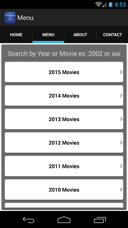 In this app you will get all songs lyrics and also you can search or filter the year list by searching with year ex: 2015 or you can also search by movie name ex: temper then the list will be filtered to year the movie was released and then you can go ahead and see the specific movie details and list of songs from that movie and then later see the lyrics of that songs from that specific movie. One can open the lyrics of the song using this app and watch the telugu video song of that movie or listen to telugu audio song of that movie and can learn the lyrics or prepare for any singing competition.