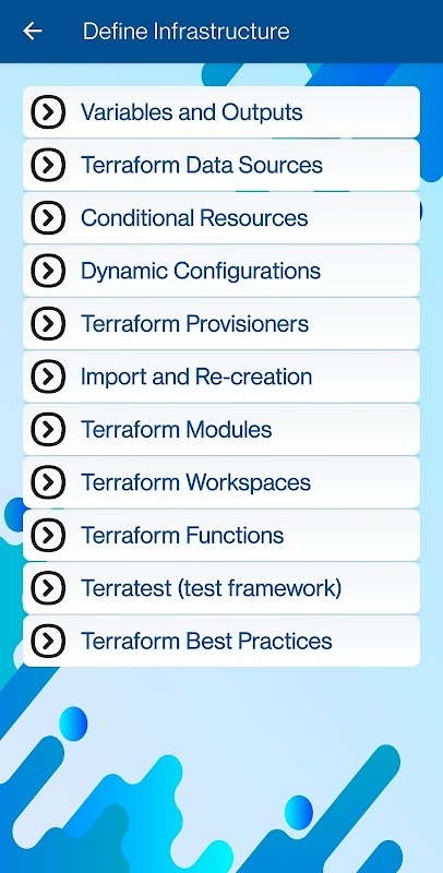 Sama ada anda seorang jurutera awan, pengamal DevOps atau peminat teknologi, apl kami menawarkan pengalaman pembelajaran yang komprehensif dan praktikal untuk menguasai Terraform, alat revolusioner untuk mengurus infrastruktur.