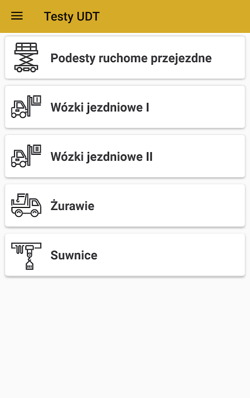 Aplikasi UDT Tests ditujukan terutamanya untuk orang yang memperoleh kelayakan dari Pejabat Pemeriksaan Teknikal untuk mengendalikan peranti. Ujian teoretikal yang disediakan dalam aplikasi dikembangkan sesuai dengan peraturan ujian teori Kantor Pemeriksaan Teknikal. Aplikasi UDT Tests tersedia untuk peranti mudah alih iOS (App Store) dan Android (Google Play), serta untuk komputer desktop Windows 7 dan 10 (muat turun di halaman ini).