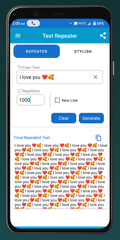 Pengulang Teks ialah aplikasi terbaik untuk sesiapa sahaja yang ingin mengulang teks dengan mudah, sehingga 10,000 kali! Sama ada anda ingin mencipta corak teks yang suka bermain, menghantar mesej berulang atau menjimatkan masa menaip, Text Repeater menjadikannya pantas dan mudah.