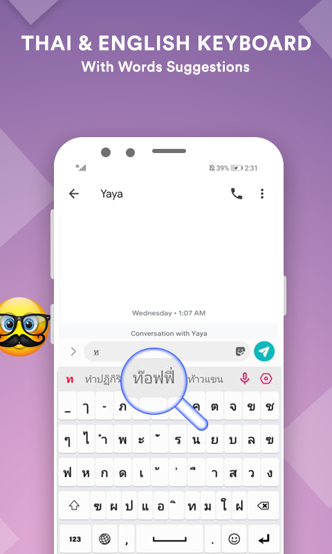 Papan kekunci Thai mempunyai ikon emoji, emotikon comel, simbol pelekat bergaya.