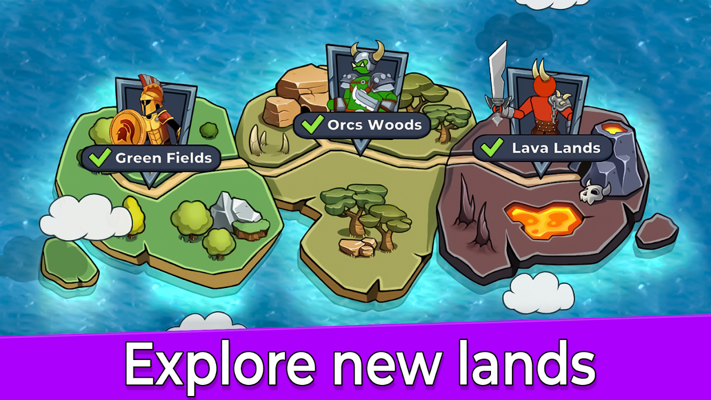 Dalam game pertarungan stickman ini Anda juga bisa menjelajahi wilayah baru dan menghadapi musuh yang berbeda. Bertemu musuh baru bisa sangat menantang! Jelajahi stickman idle dan keterampilan game santai dan cari kelemahan lawan dengan game santai yang seru dan mengasyikkan. Bertarung di Green Fields, tantang musuh Anda di Orcs Woods, latih keterampilan pertahanan game santai di Lava Lands, dan masih banyak lagi!