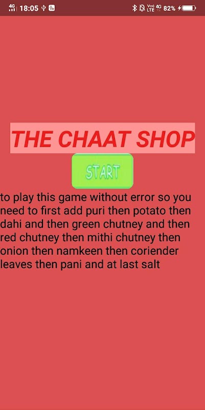 and please read the following discription to play this game without error so you need to first add puri then potato then dahi and then green chutney and then red chutney then mithi chutney then onion then namkeen then coriender leaves then pani and at last salt