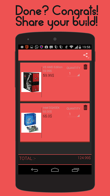 With This Application you can choose from a number of Parts and Assemble A computer which can meet all your needs . You can also Share your build's with your friends (probably showoff a bit XD ) . You can also use this application to make a computer to meet your office need's . All you need is just your smartphone and the internet.